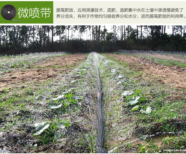 4、喷灌带适应坡地和凹凸不平的耕地,节约土地,不易造成水土流失和土壤板结。有利于形成微生物的良性循环,改善田间小气候,提高作物产量,改善作物品质。这是其他灌溉方式所不具备的。此外,喷灌设施还可以起到施肥和喷洒农药的综合作业。